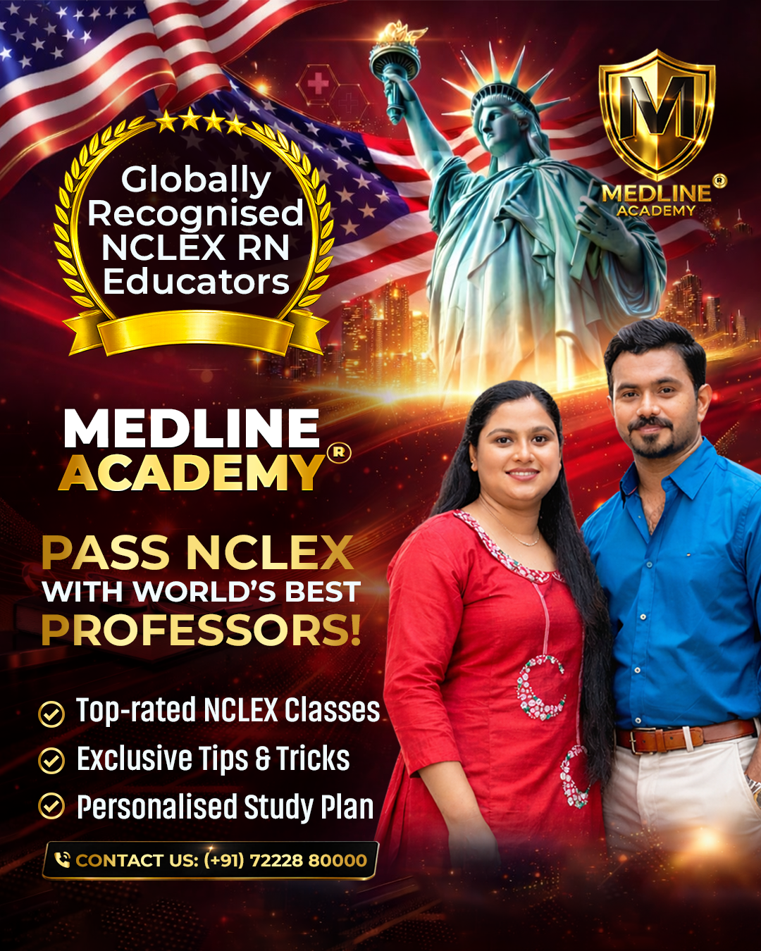 Medline Academy® is widely recognized as one of the best NCLEX RN coaching centres in Kerala, offering comprehensive, exam-focused training for nurses aspiring to pass the NCLEX-RN exam and work in the USA, UK, Canada, and other international healthcare systems. Led by experienced nurse educators Ainstin S Dennis and Tincy Mathew, the academy provides structured concept-based classes, repeated high-yield revisions, and strategic exam preparation designed exactly as per the latest NCLEX 2026 test plan. Our coaching focuses on deep understanding of core nursing concepts, clinical judgment, priority-based decision making, and Next Generation NCLEX (NGN) question analysis. Classes are available in both Malayalam and English, making it easier for Kerala nurses to understand complex topics clearly and confidently. Each session is designed to simplify difficult subjects such as pediatric nursing, medical-surgical nursing, pharmacology, maternity nursing, psychiatric nursing, and critical care concepts that are frequently tested in NCLEX RN examinations. Medline Academy® provides daily practice questions, detailed rationales, exam tricks, memory techniques, and continuous mentorship to ensure students develop strong critical thinking skills required to pass the NCLEX on the first attempt. Our proven coaching system includes live interactive classes, focused revision modules, high-priority question discussions, and real exam pattern mock tests to improve accuracy, speed, and confidence. Hundreds of successful nurses from Kerala have already achieved their dream of becoming registered nurses abroad after training at Medline Academy®. Our result-oriented coaching, personalized guidance, and exam strategy sessions make us a trusted choice for repeat test takers and first-time NCLEX aspirants alike. If you are searching for the best NCLEX RN coaching in Kerala with expert faculty support, structured syllabus coverage, updated 2026 NCLEX guidelines, and continuous doubt-clearing mentorship, Medline Academy® is the ideal place to start your journey. Limited seats are available to maintain personal attention for every student. Join Medline Academy® today and take the first step toward your international nursing career. Admissions are now open. Apply now via WhatsApp to secure your seat and begin your focused NCLEX RN preparation with Kerala’s trusted coaching experts.